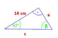 | · 14 14 · tan 62° = a a = 26,33 cm c 2 = 14 2 + 26,33 2 | √ c = 29,82 cm β = 180° – 90° – 62° = 28°