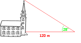 Ein 1,80 m großer Mensch (Augenhöhe 20 cm niedriger) peilt aus 120 m Entfernung die Spitze eines Kirchturmes unter einem Winkel von 28° an.