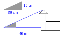 Paul versucht, die Höhe einer Kirche zu ermitteln. Er schneidet ein rechtwinkliges Dreieck aus Karton mit den Maßen 30 cm x 15 cm aus. Nun geht er zur Kirche und entfernt sich von ihr in Meter-Schritten, wobei er ständig über das Dreieck die Turmspitze anpeilt. Nach 40 Schritte hat er sie im Visier.