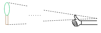 Dein Daumen sei etwa 6 cm groß und befinde sich etwa 60 cm von deinem Auge entfernt. Du entfernst dich so weit von einem Baum, bis er genau von deinem Daumen verdeckt wird. Dabei bist du 45 Schritte (1 m) nach hinten gegangen.