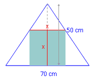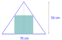 Einem gleichschenkligen Dreieck mit der Basis 70 cm und der Höhe 50 cm wird ein Quadrat einbeschrieben. Das heißt, es wird ein Quadrat integriert, das mit seinen Ecken die Seiten genau berührt. (Es ist das größtmögliche Quadrat, das in das Dreieck passt.)